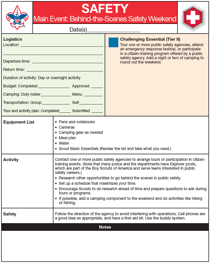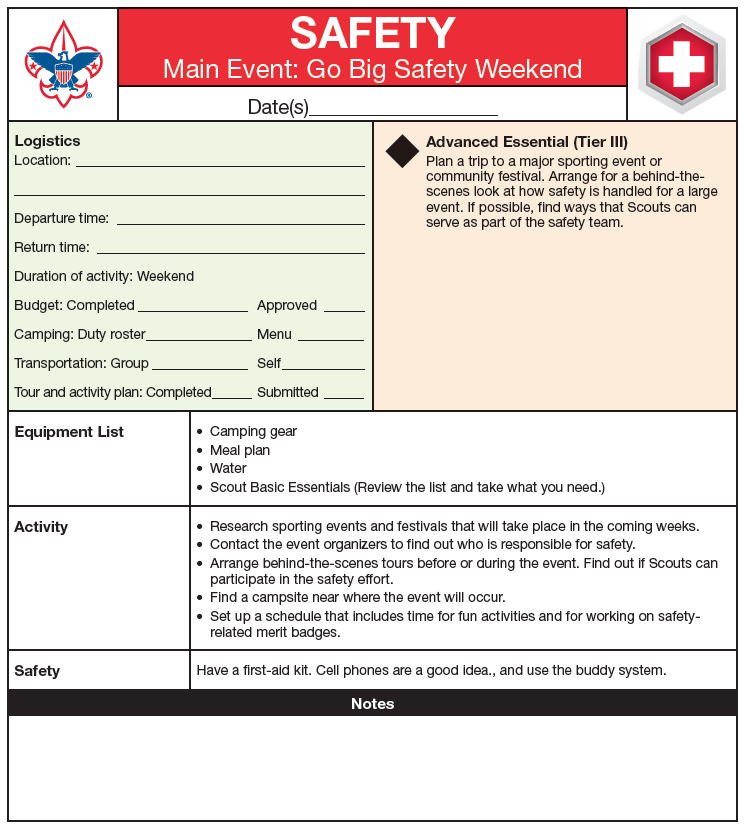 The following three sample outing outlines can serve troop leaders as a point of reference, or as an actual framework, for the monthly main event relating to the safety program feature. Click on the small images to bring up a full-size view.